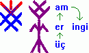 © 1991 doğan türker üç.er.am.ingi * Türk evrendoğumu’nda (cosmogenesis) Oğhuz Khan+(am)’ın am.er.okh (ana, baba, çocuk ~ aleph, beth, gimel) @ okh.er.am (gün, ay, yıldız & gök, dağ, deniz ~ ar. keram+et; gr. keramik) buyruğu ile dile getirdiği üç erim iminin incisi (yaratılış & var oluş & yok oluş) is.im. öge’si (isim / imge / öge & simgeleri), üç yer’in üç er can’a & üç er can’ın üç yer’e / ış.(oğh.or).am : al.am, uğurlu ışığın şu(ğ)ur ışım alavı ya da çıra(m) > ar. meş’ale{v}; eng. torch (of enlightment); hint. shamballa, gibi gökten at.ut+uç. or.okh (ateşli ucu tutuşarak) erimi & inişi; havaya, suya, topraka düşen üç oğh.uz. am : ing.(ök).erk’i (cosmic energy); üç cemre; theol. üçlem; > ar. teslis; eng. trinity; Bkz: oğh.er.am